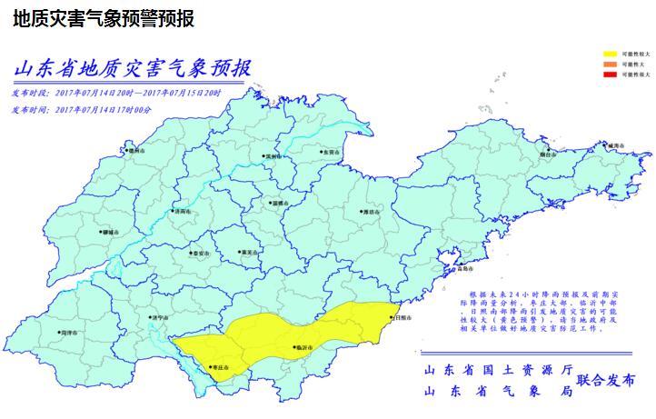 7月14日17时山东国土资源厅、山东气象局联合发布地质灾害气象预警预报,根据未来24小时降雨预报及前期实际降雨量分析,枣庄大部、临沂中部、日照南部降雨引发地质灾害的可能性较大(黄色预警),请当地政府及相关单位做好地质灾害防范工作。
