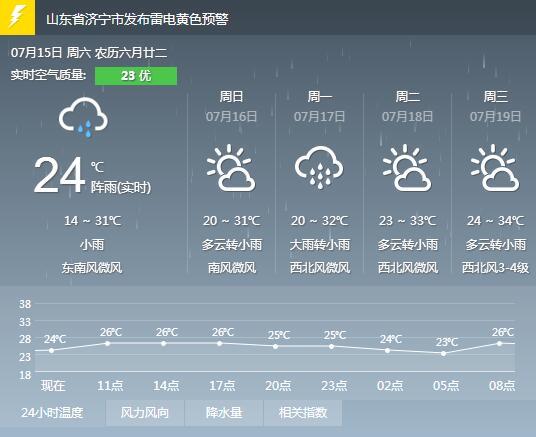 山东省气象台于7月15日06时00分发布暴雨黄色预警信号并继续发布雷电黄色预警信号。目前枣庄已出现100毫米以上的降水,济宁、日照和临沂的部分地区出现50毫米以上的降水,降水仍将持续。预计今天白天到夜间,鲁东南和鲁中地区仍有大到暴雨局部大暴雨,鲁西北地区有雷雨或阵雨,其他地区有中到大雨局部暴雨,大部地区伴有雷电,雷雨时阵风7~8级,雷电较强,可能会造成雷电灾害事故。