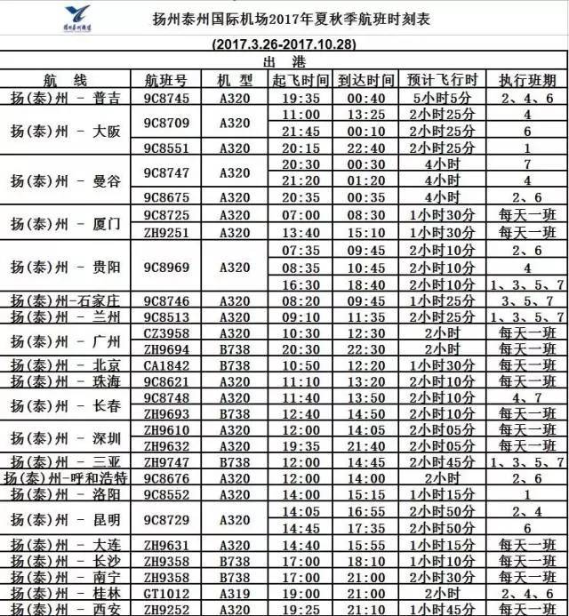 新航季中,扬州泰州国际机场的出境航班有至普吉、大阪、曼谷三个