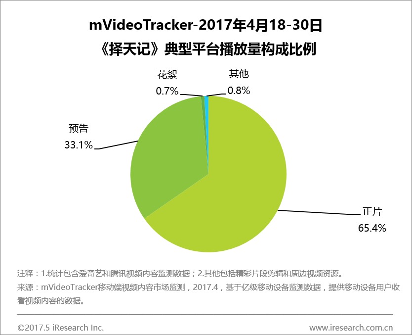 截止4月30日,《择天记》在典型视频平台的播放量主要由以下几个方面构成,正片部分占比65.4%,预告内容占比33.1%,花絮、精彩片段剪辑和周边宣传视频占比加总仅为1.5%。由此可见,当每天更新量有限时,预告才是满足追剧热情的良药。而花絮和周边宣传视频因资源数量有限,因此在播放量上表现并不显著。
