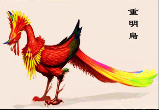 重明鸟,形状像鸡,叫声如凤,两目都有两个眼珠,所以叫作重明鸟,也叫重睛鸟。它常常把身上的羽毛全部抖落,用光秃秃的翅膀拍打着没有羽毛的身子,在高空中飞翔。它能驱逐豺、狼、虎、豹等猛兽,使它们不敢危害人类。它又眷恋自己的家乡,所以它不在的时候,人们就用木头或铜铁铸成重明鸟的形状,放在庭院里,因其像鸡,所以后世逐步改为画鸡或剪窗花贴在门窗上来驱邪。