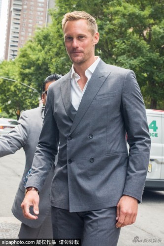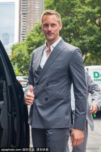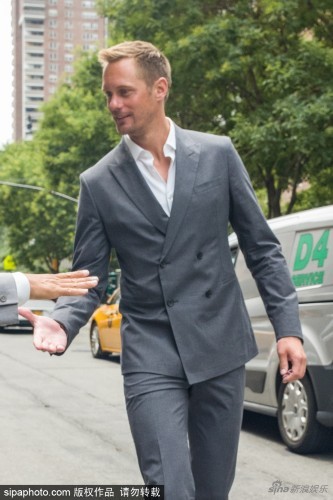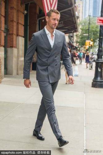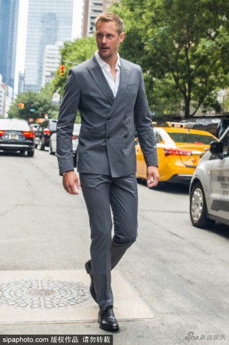 瑞典性感男星亚历山大·斯卡斯加德(Alexander Skarsgard)穿灰西装现身美国纽约街头笑容腼腆,腿长堪比超模。