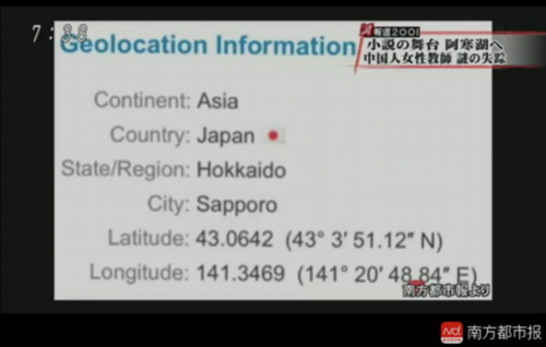 8月13日,日本媒体又曝光了多段危秋洁失联前的监控视频,显示其随身携带的iPad离奇消失,同时援引南方都市报的报道进行了IP地址定位模拟。
