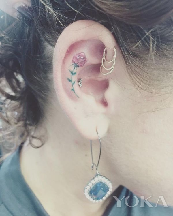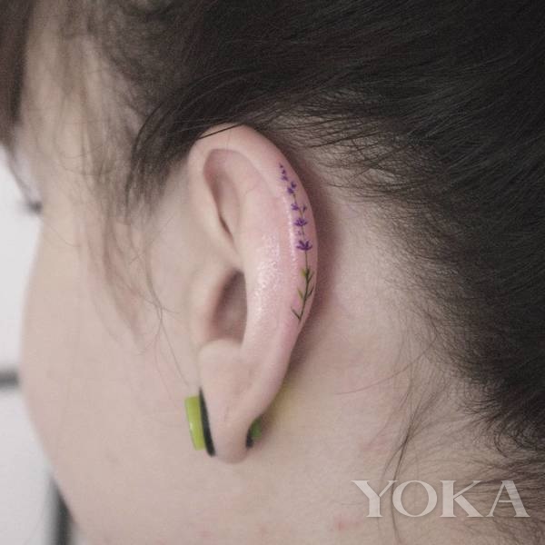 除了耳廓内部,二轮部位也很适合纹身,可以利用耳轮天然的弧度,让这些纹身的小图案更加生动。比如纹身一只纤细的小花,紫色的花朵和绿色的叶片显得生机勃勃,好像一只微型的植物标本一样,十分适合春夏季,即使不去真的纹身,大家也可以找类似的纹身贴尝尝鲜!