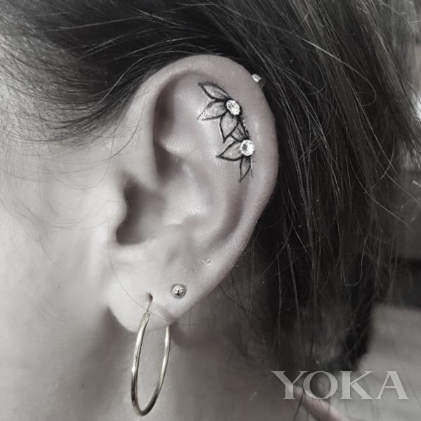 比如这样在耳廓内侧纹上两朵小花,在花蕊的位置戴上两只耳骨钉,将二维和三维的装饰巧妙结合,新颖独特。
