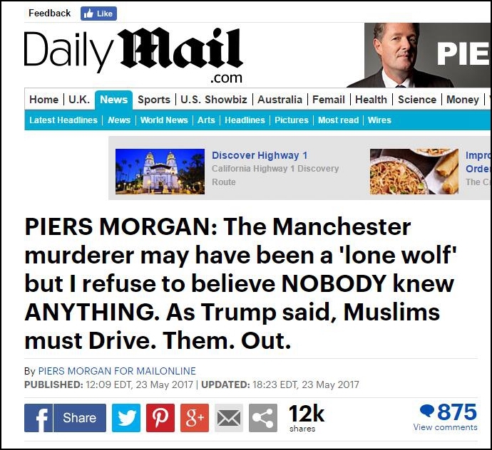 据英国《每日邮报》23日报道,英国知名媒体人、《英国达人秀》和《美国达人秀》的评审人皮尔斯·摩根(Piers Morgan)声称:"曼彻斯特的袭击者是一个'独狼式'的袭击者,但是我不相信在他发动袭击之前没人知道他想做什么。就像特朗普说的,穆斯林必须被赶走。"