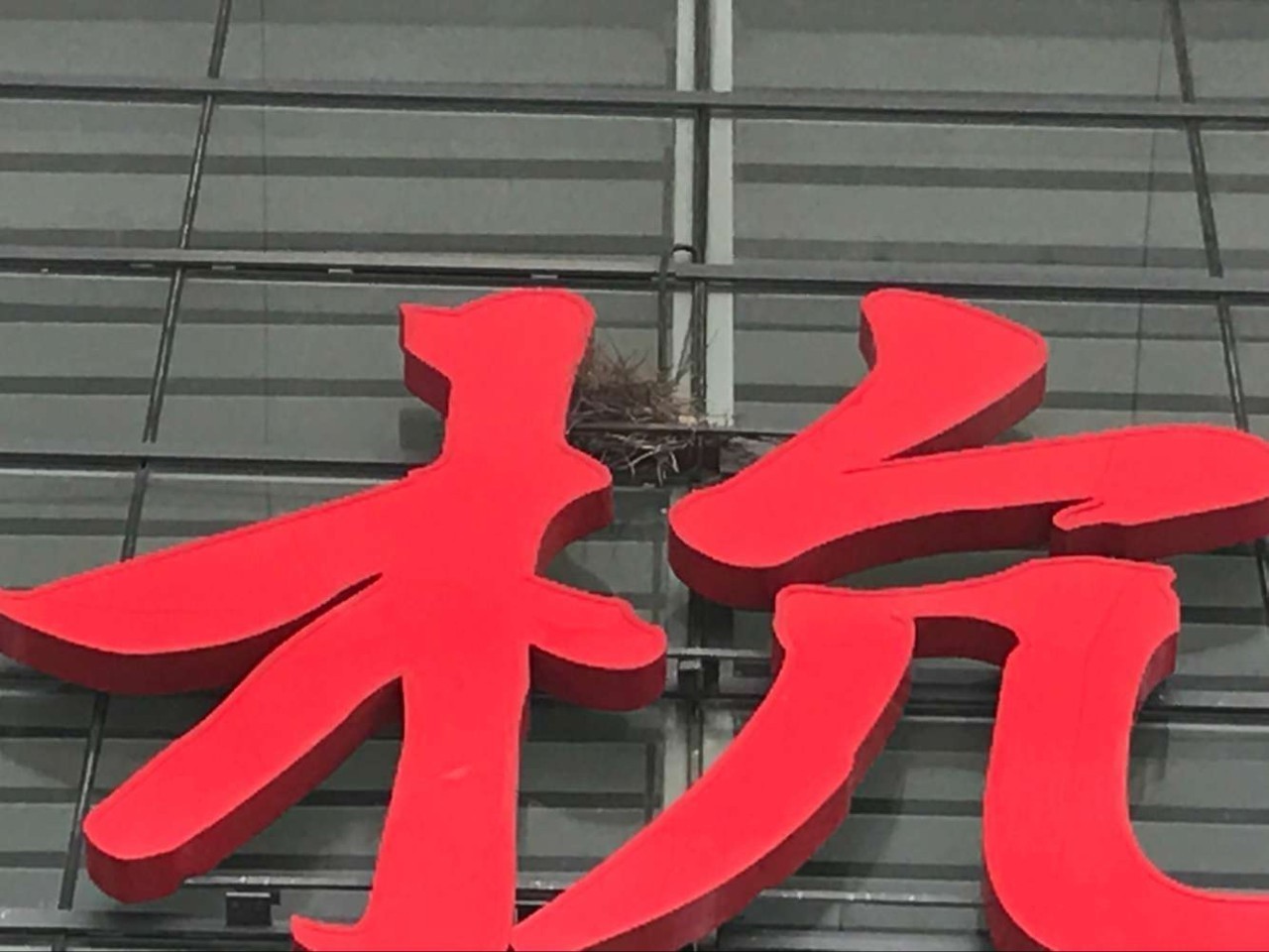 这个鸟巢正好筑在固定"杭"字的偏旁和部首灯箱的一根钢架子上,依靠着玻璃幕墙和"木"字偏旁,形成了一个有利地形。鸟巢全部是由树枝末梢搭建,看起来体积有一只脸盆大小。难不成,鸟儿也知道在"杭"字上安家?