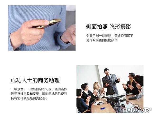 侧面拍照,隐形摄像,侧面手档一键拍照,美好瞬间留下,为您带来更便携的操作。成功人士的商务助理,一键录音,一键抓拍会议记录,还能当作镜子整理容妆和发型,随时随地的给你便利。