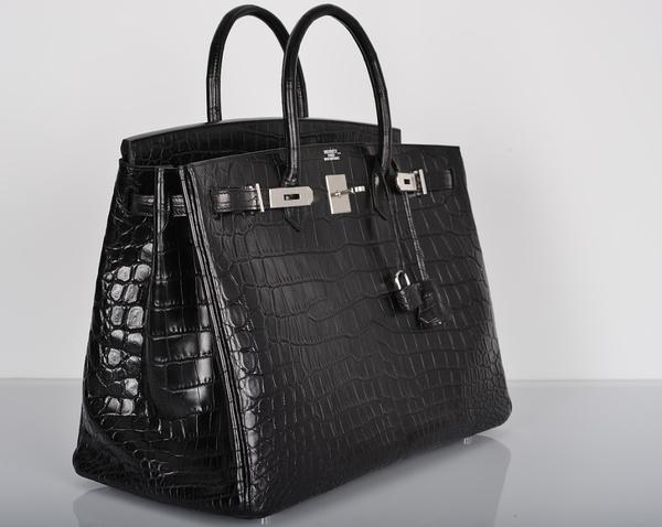 亮黑色鳄鱼皮,又一款经典的爱马仕柏金包(Birkin),包包搭扣上镶嵌了10克拉白钻。
