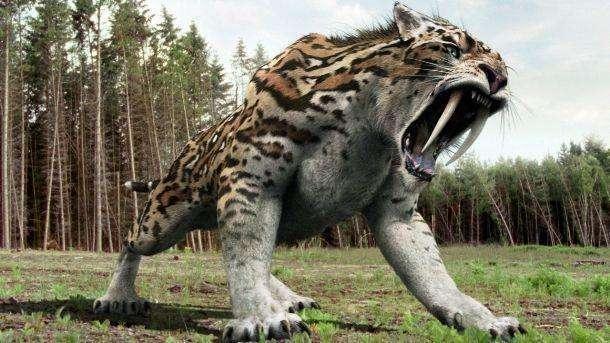 刃齿虎:一种出现于上新世晚期的大型猫科动物,是当年巨颏虎进入美洲之后演化出的新类型。它们长有非常夸张而尖锐的"匕首牙",体型巨大,而且灭绝晚、出土化石很多。