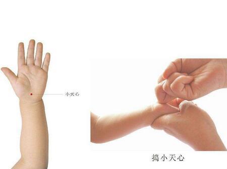 孩用一只手托住孩子四指,掌心向上,然后用另一手的拇指或中指指端揉,称揉小天心;用拇指甲掐压,称掐小天心;以中指指端或中指屈曲关节捣,称捣小天心。