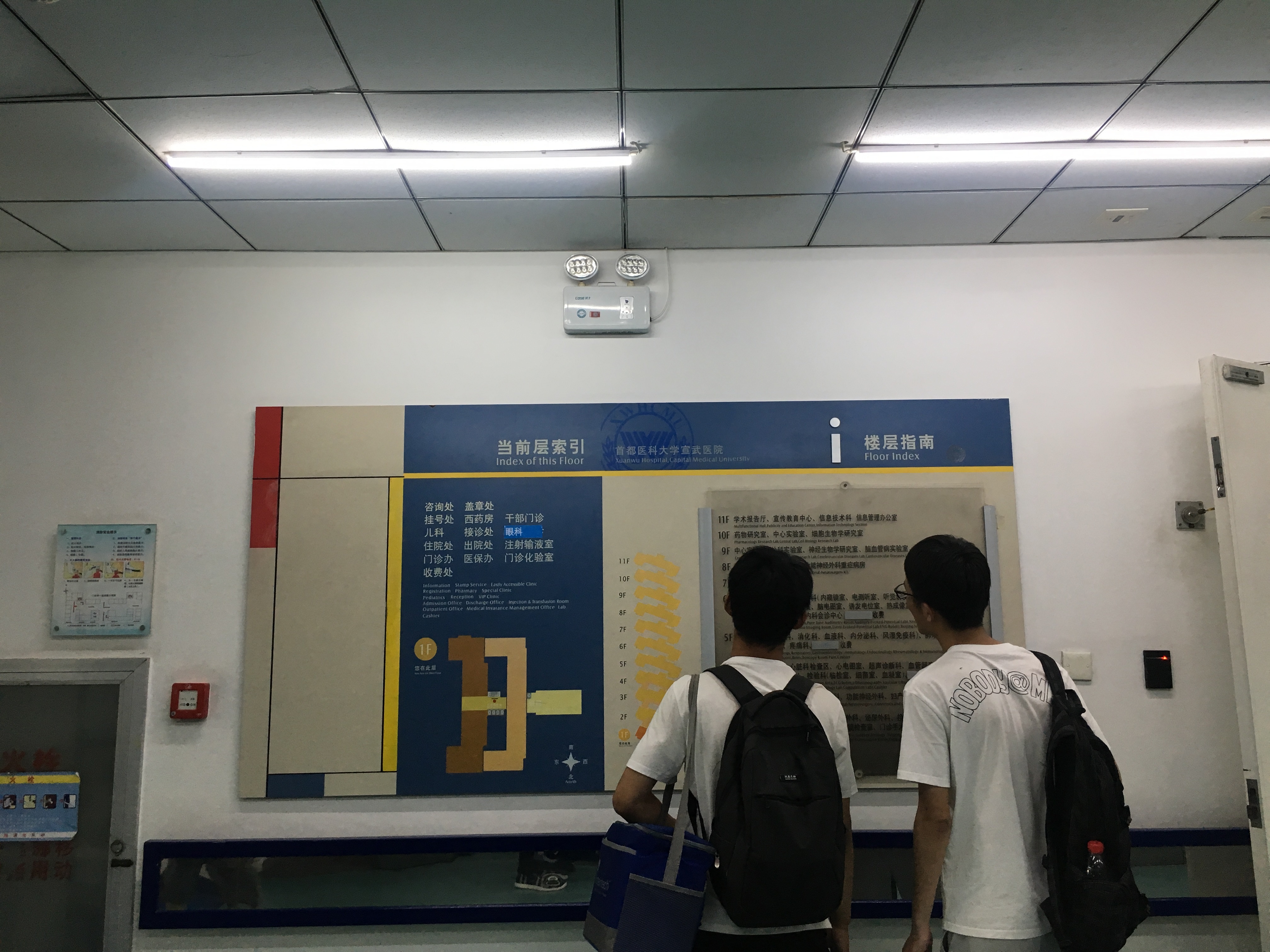 6月24日,宣武医院门诊楼内,两个年轻人查看楼梯口的索引信息。摄影/新京报记者 马瑾倩