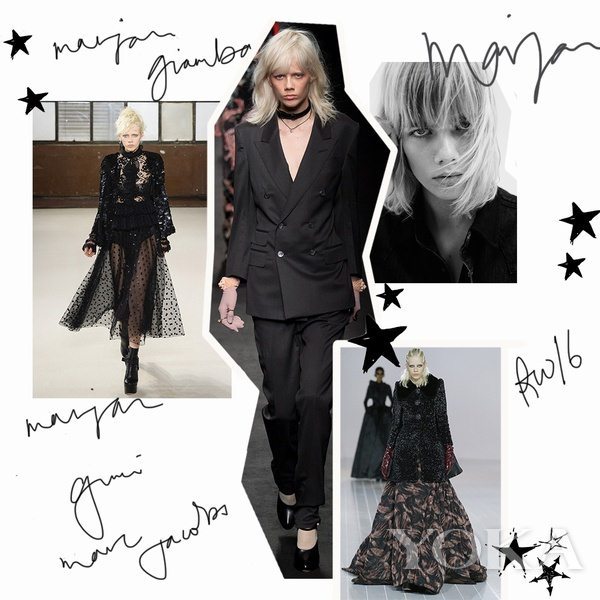 2014年正式出道的Marjan Jonkman,一出道就接连走了Gucci,Max Mara,Saint Laurent等多个大牌的大秀。一头金发的她,在镜头前总是特别的酷,很有质感。不算精致的五官却在独特的气质下让人感到舒适且高级,时尚界的大咖小马哥对她也是喜爱有加,因此Marjan Jonkman多次在Marc Jacobs的秀场有广告大片中亮相。