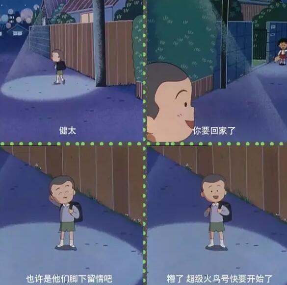 此时插入一段小花絮:小丸子对这位足球少年的情愫愈发浓烈,某一天晚上她到门外取报纸,正好遇上了结束训练课回家的健太,两人有了一番对话。小丸子称赞健太球踢得很好,健太谦称"也许是他们脚下留情吧",然后健太问小丸子现在的时间,随后突然意识到"超级火鸟号快要开始了",便匆匆跟小丸子告别。