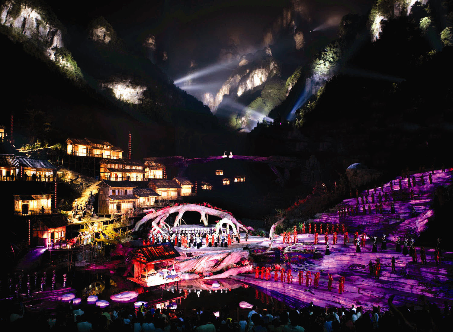 剧中的中心舞台搭建在溪谷之上,望之就如一颗横卧的古树浮于涓涓溪流之上,与周围的天然山石完美相融。舞台面积总10000平方米,不仅是目前全球最大的演出舞台,而且全部采用玻璃钢设计,灯光照射下通体透亮、色彩变换,营造出一幕幕令人惊异的奇幻场景。