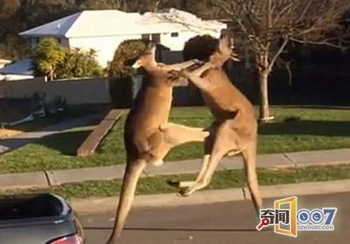 动物打架的姿势可谓是千姿百态,有的凶猛,有的呆萌可爱。在澳大利亚的一条大街上,有两只雄性的袋鼠在打架。这两只袋鼠从大马路边一只扭打到一辆汽车旁边,然后又从汽车旁边扭打到了一户人家的院子里。