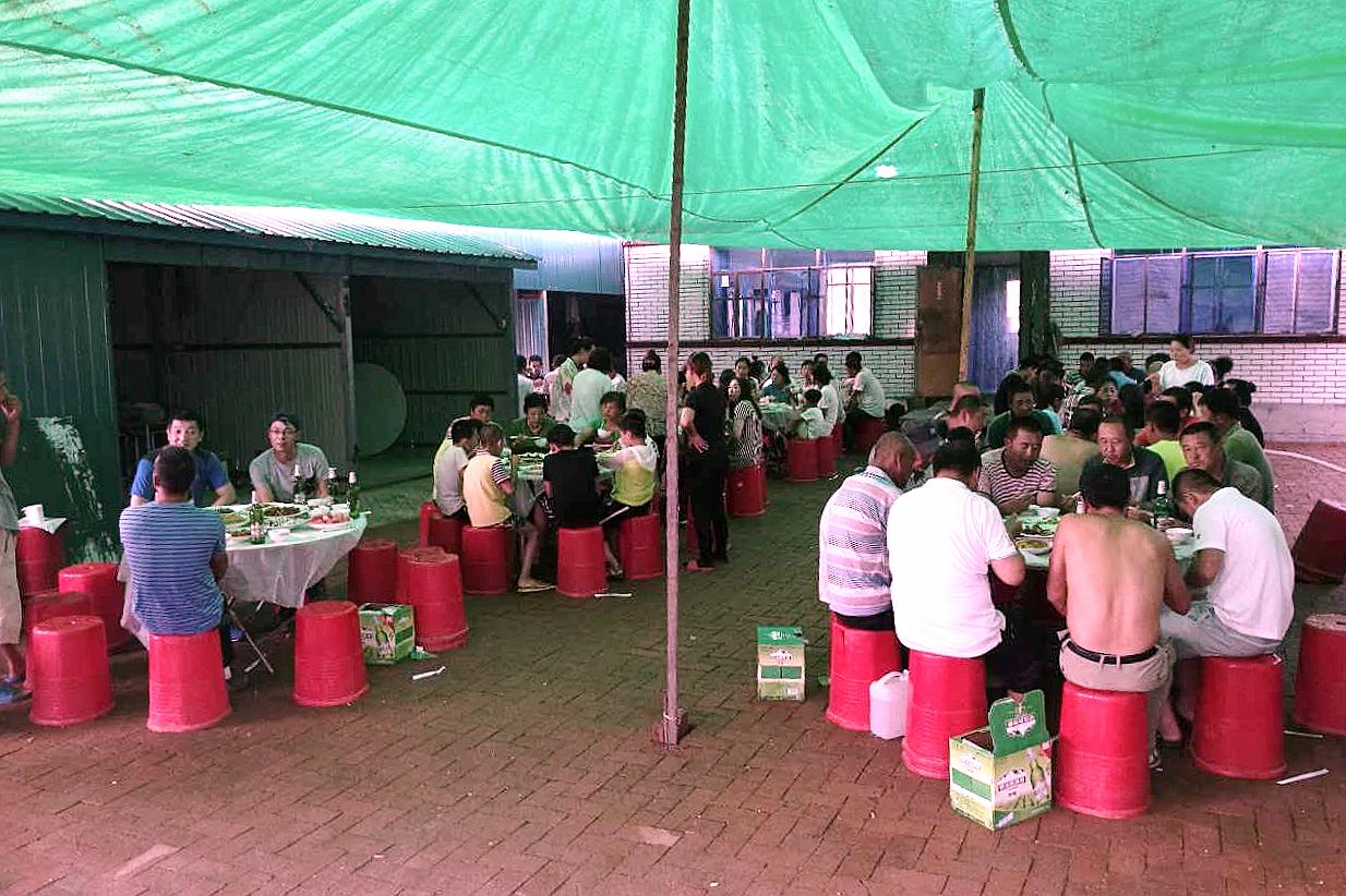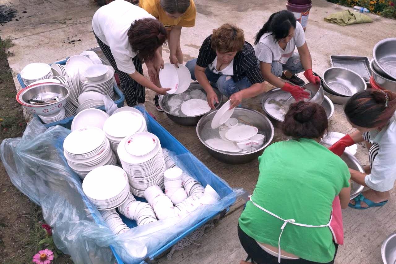 来帮忙的人员在早晨会先吃上一桌简单的酒席,吃完后就开始忙活为中午的酒席做准备工作。