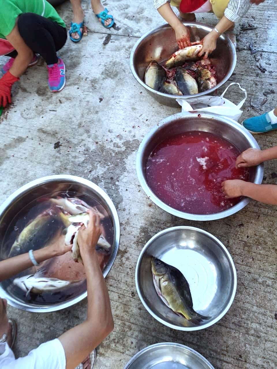杀好的鱼交由这几位大嫂做进步清理,每条鱼都要处理的干干净净。