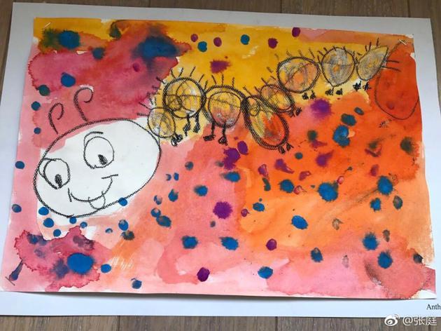 5月10日上午,张庭晒出儿子林秉翰(英文名Anthony)的画作,一张张图画上的青蛙、小鱼、长颈鹿。。。。。。形态各异,五彩斑斓,尽显童趣。张庭很为5岁的儿子骄傲,配文道:"艺术细胞遗传的谁呀?"还配上夫妻俩与儿子的合照,Anthnoy继承了妈妈的好基因,眉目清秀,与爸爸嘟嘴亲亲,萌态十足。