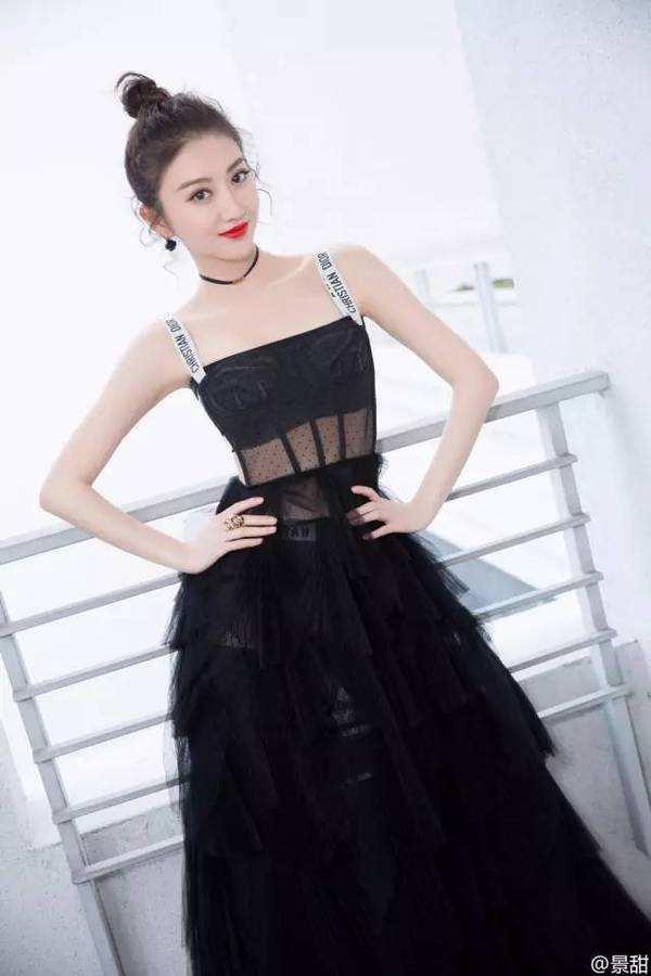 景甜曾经也在活动上穿过吊带抹胸晚礼服,同样的黑色,和赵丽颖的晚礼服有异曲同工之妙,也是丸子头,不过景甜的四叶草耳饰更加的时尚,和适合这身晚礼服。