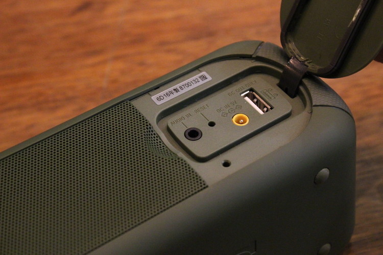 SRS-XB30蓝牙音箱的控制按键都在顶部;而在后部分的一体式设计防水盖背后提供的是音源输入、电源接入以及电源输出接口。