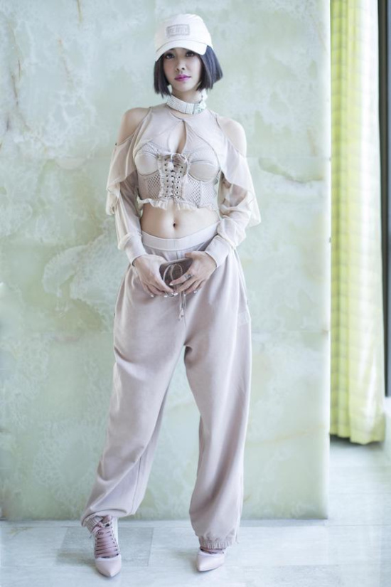 蔡依林出席活动,以短发造型亮相,身穿宫廷风系带紧身胸衣搭配同色长裤,轻薄性感的贴身上装加上显而易见的腹肌线条,美帅撩人,尽展霸气台风。