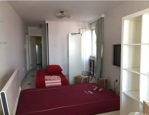 因为没有客厅和卧室的空间区分,原屋主将床和沙发靠在一起,电视机在床尾,饭桌在窗前,相当于将客厅、餐厅、卧室融为一体。