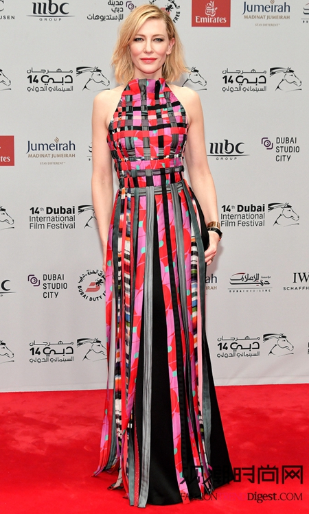 Cate Blanchett:高脖领的露肩长款连衣裙是灵动的波普图案,束腰设计让身材比例非常完美!上身是格纹,裙摆是竖条纹,一点点的小变化就让这款连衣裙有了讨喜之处。