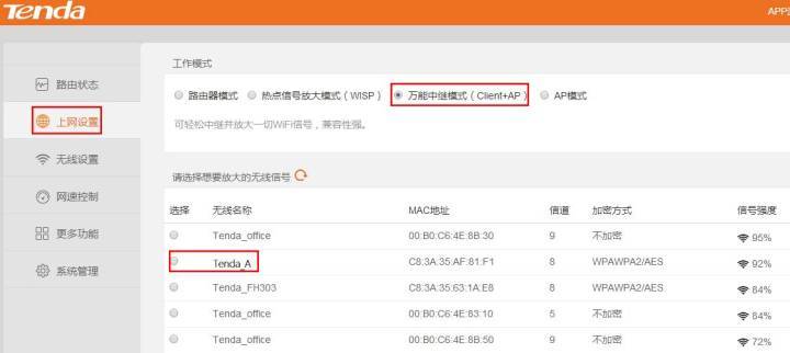 点击【上网设置】--工作模式选择【热点信号放大模式(WISP)】或【万能中继模式(Client+AP)】,请根据自己的需求选择相应模式。例如,选择【热点信号放大模式(WISP)】,再选择【万能中继模式(Client+AP)】