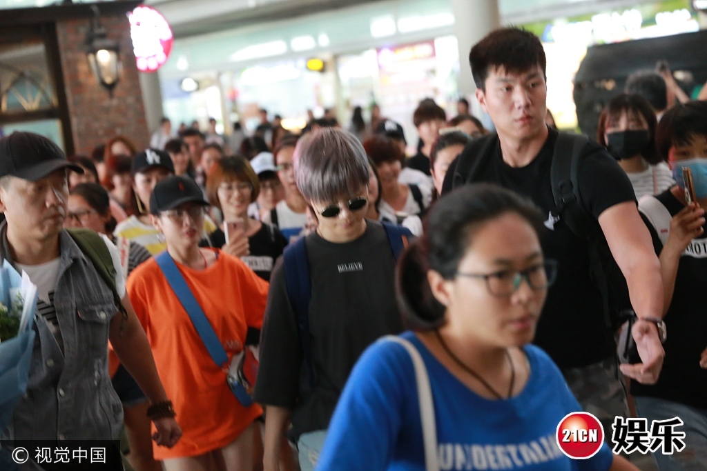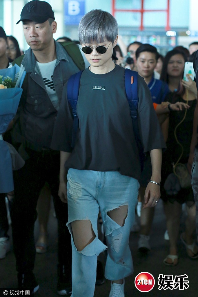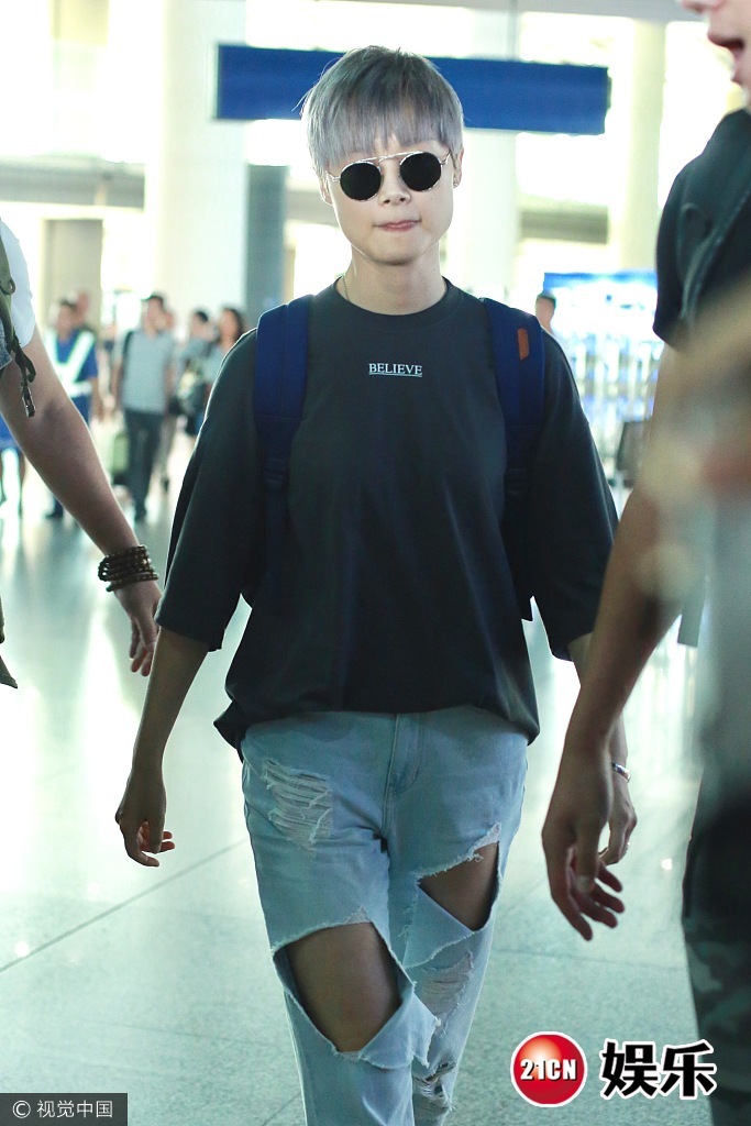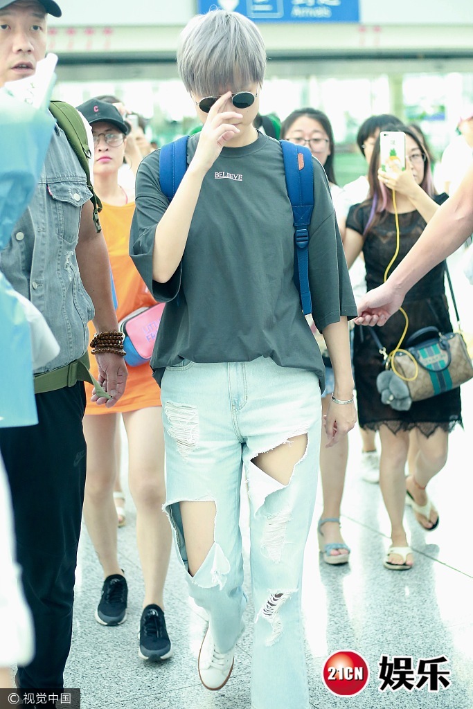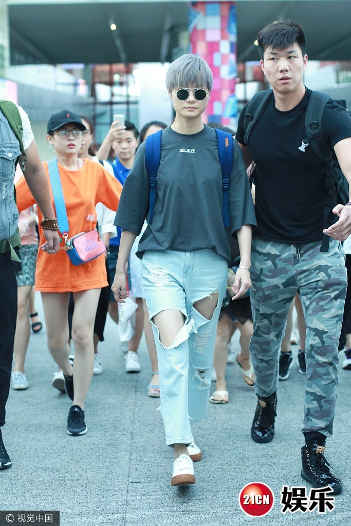 2017年7月8日,北京,李宇春现身机场, 穿破洞牛仔裤顶"奶奶灰",推眼镜扮帅,低头疾走遭迷妹围堵,获保镖开路护驾。