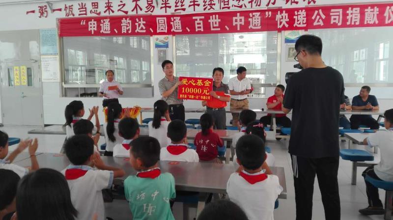 捐赠仪式在何坊街道中心小学举行,出席仪式的有申通快递公司经理赵爱民先生、韵达快递公司经理胡云波先生、圆通快递公司经理李洪波先生、百世快递公司经理闫建先生和中通快递公司经理马林先生。