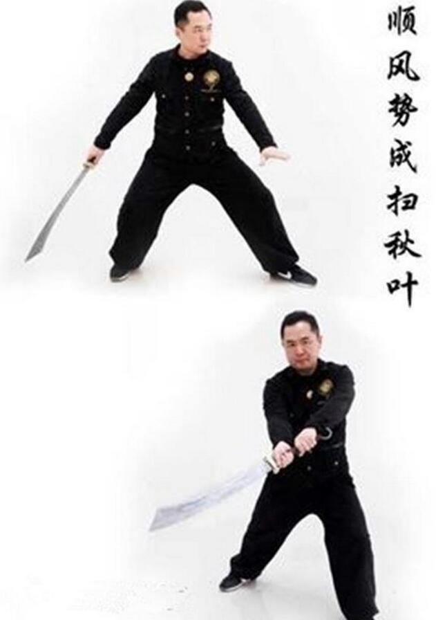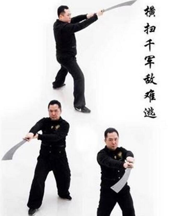 第二刀:掉手横挥使拦腰。敌刺我时,用刀上架。接着上步用一刀横抹其颈部,敌收枪急退,我上步转身斜扫其腰部一刀。