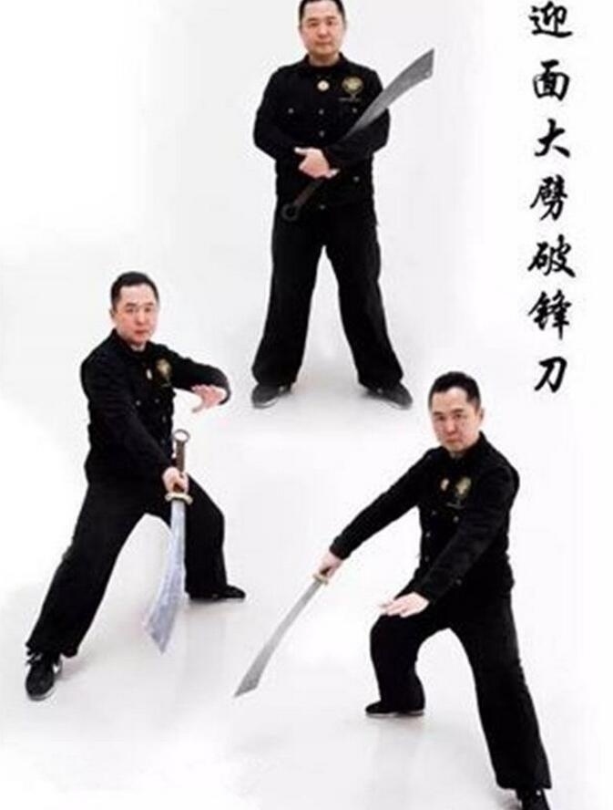 第一刀:迎面大劈破锋刀。敌刺我时,上步换位躲开刺刀,一刀把对方枪隔开,反手一刀砍对方颈肩膀,若劈空,在敌反击时,手按刀背,连劈带按带后拉刀,压住敌刺刀。