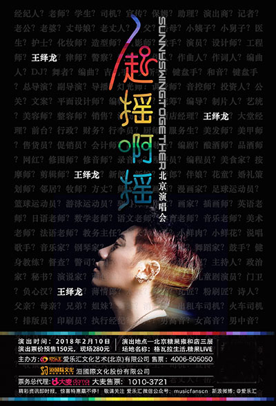 「如果我是DJ,你会爱我吗? 你会爱我吗? 」 、「谁是电音之王? 我是电音之王! Everybody跟我一起 嗨嗨嗨」、 「让我们一起摇啊摇啊~摇啊摇, 让这个世界从此不再有烦恼 ;让我们一起摇啊摇啊摇啊摇 ,自由自在才是我们的目标!啦啦啦~~啦啦啦~」 这些歌大家是不是耳熟能详? 没错,他就是中国电音教父王绎龙的几首成名曲, 2007年出道,十年了 ! 喜爱电音的乐迷们终于盼到王绎龙人生第一场个人演唱会! 由行业资深演出集团爱乐汇文化承办的王绎龙《一起摇啊摇》演唱会,将于2018年2月10日(星期六)在北京糖果三层格瓦拉 ,2018年2月11日(星期日)上海mao 空间接连上场!