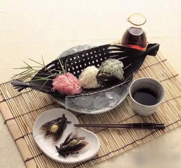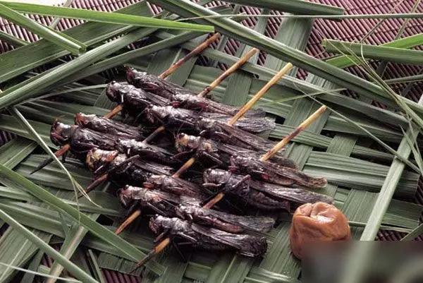 吃蝗虫本身其实不是什么新鲜事儿,但日本这道料理与众不同在蝗虫是"男女搭配"串联在一起,在辅料中添加梅子,别有一番风味。