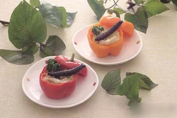 这道料理使用的是甘薯天蛾的幼虫。成虫翅膀张开可达90-100毫米,飞翔能力强,几乎分布在全世界各地。而幼虫是食叶性害虫,专吃甘薯等旋花科植物的叶子。