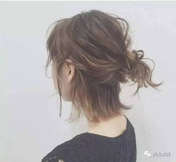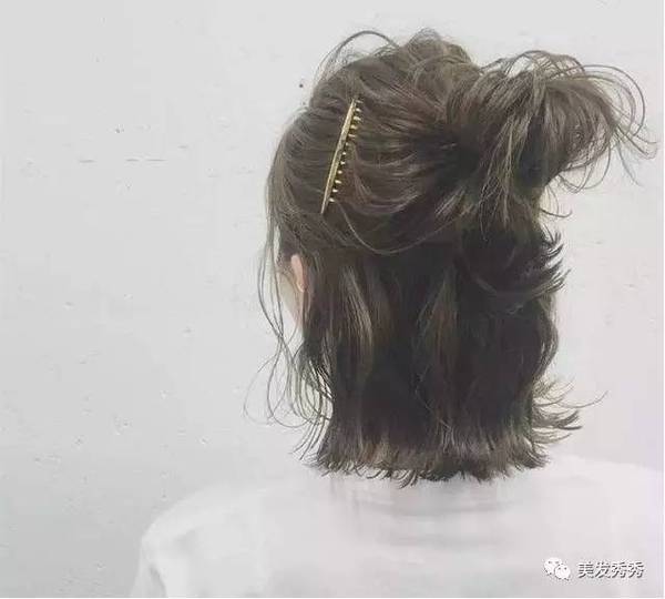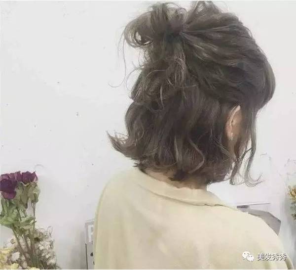 短发半丸子头,发尾外翘的短发上半部分扎一个对折的小马尾,就是一款很显慵懒气息的半丸子头,越蓬松越时髦。