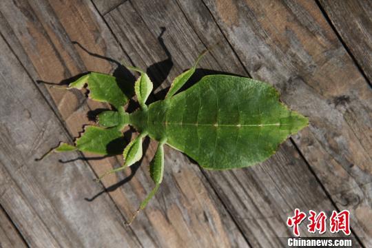 中新网昆明5月24日电 (陶平 毛雪兰)24日,一只长相独特,外形极度酷似树叶的昆虫滇叶䗛出现在云南普洱小熊猫庄园,该虫近10公分长、5公分宽,是极为珍稀罕见的竹节虫品种。