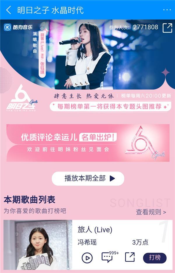 《旅人》在酷狗迷倒了不少人,被网友赞“超适合电视剧插曲,非常有画面感,声音真的超干净”。《旅人》还以3万点助力值的成绩拿下酷狗《明日之子》节目互动专区人气歌曲榜TOP1,这首歌确实深得人心。