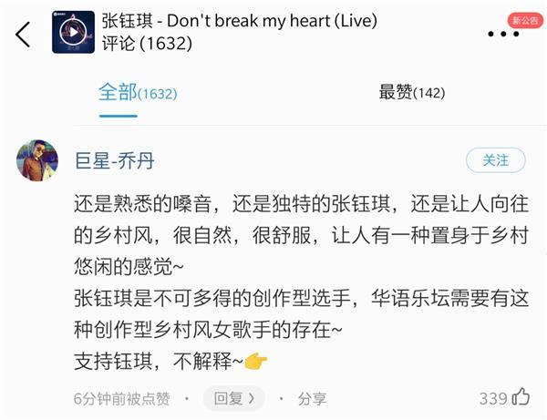 不少网友纷纷涌入酷狗重温《Don’t break my heart》并留言打call,评论数秒破999+,有网友感慨“还是熟悉的嗓音,还是独特的张钰琪,还是让人向往的乡村风,很自然,很舒服,让人有一种置身于乡村悠闲的感觉”,并高呼“华语乐坛需要有这种创作型的乡村风女歌手的存在”。