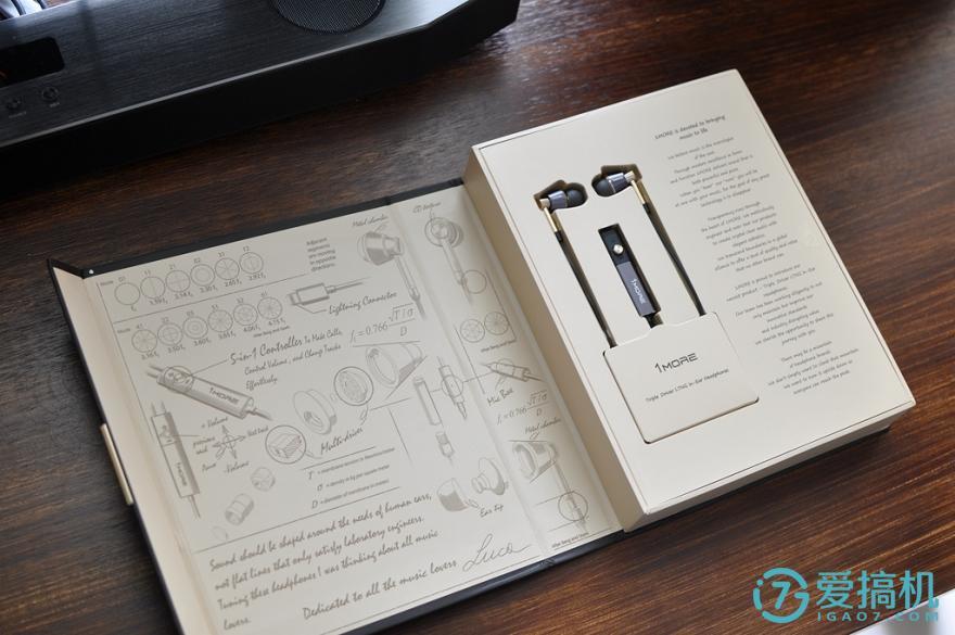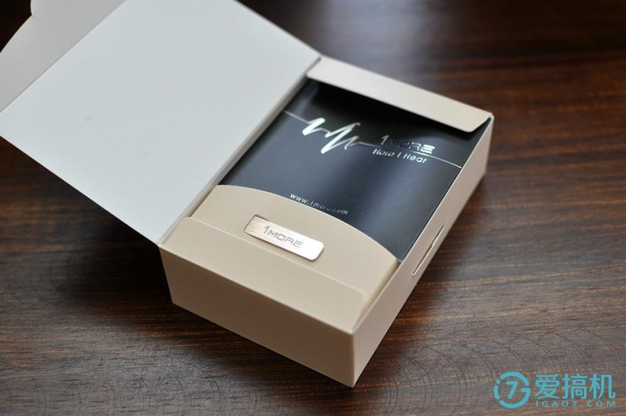 这款1MORE的包装最牛的设计在封口处,外包装采用左右翻盖式设计,就跟翻字典一样,但是在翻盖出加了方便翻阅的金属铭牌,再印上其品牌,卧槽!!!