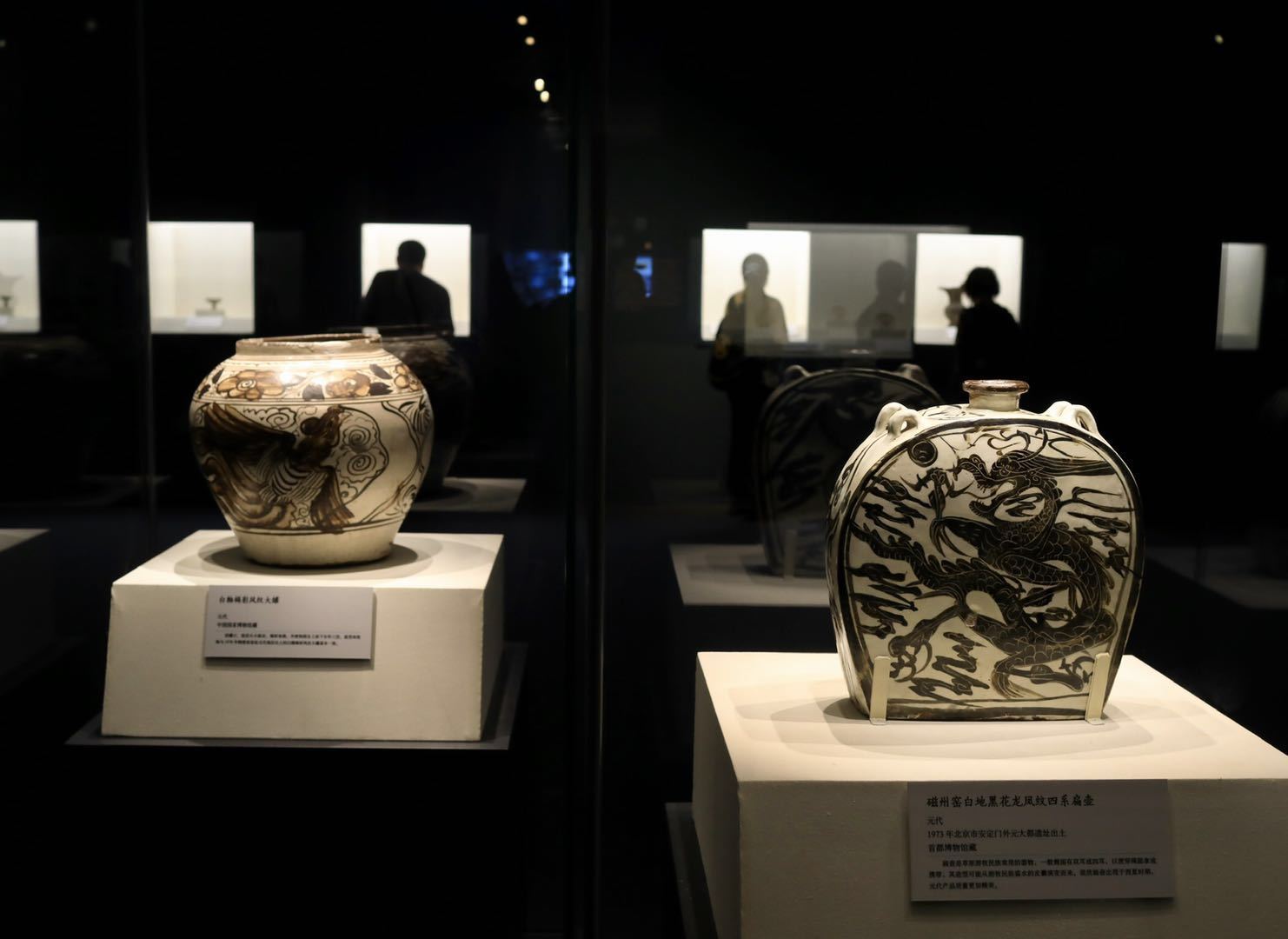 白地褐彩龙凤纹大罐和磁州窑白底黑花龙凤纹四系扁壶。