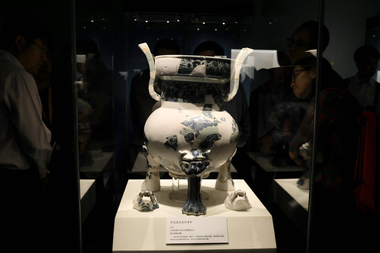镇江博物馆藏青花海水龙纹香炉。摄影/新京报记者 浦峰