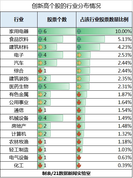 另外创新高股票数量超过4%的行业有家用电器、食品饮料、建筑材料。