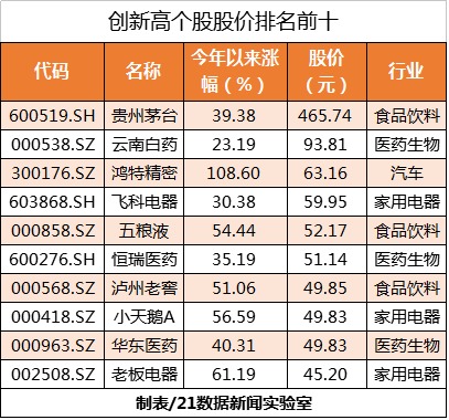 在这些创新高的个股当中,贵州茅台是股价榜中唯一的百元股,稳居两市第一高价股。在45个股价创新高的上市公司中,按一级行业来分,创新高个股最多的五个行业分别为:家用电器、医药生物、食品饮料、电子、机械设备。