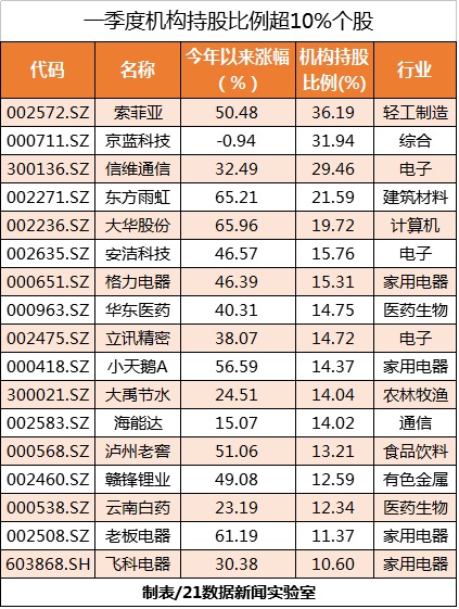 统计显示,上述个股中,今年一季度以基金、社保基金、QFII、险资等为代表的机构持股比例超5%的个股有27只,占比六成。其中,索菲亚、京蓝科技、信维通信、东方雨虹、格力电器、泸州老窖等17只个股今年一季度机构持股比例均在10%以上。