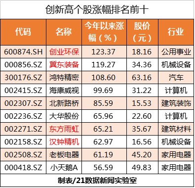21数据新闻实验室统计显示,剔除最近一年上市的新股和ST股,近一个月以来,沪深两市一共有45只股票创了历史新高。