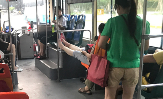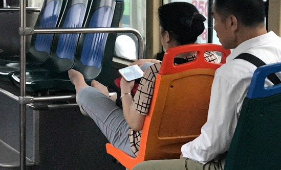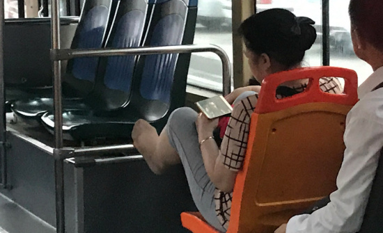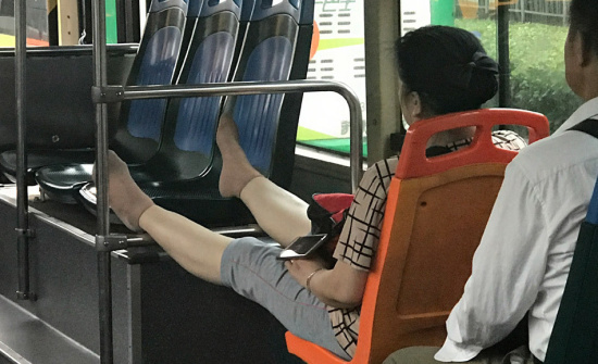 今天(6月21日)早上5点52分,市民"刀刀"(化名)从番禺大石桥南站坐上301A路公交车后,看到一位正在煲剧的大妈,高翘双腿,姿势相当豪放。