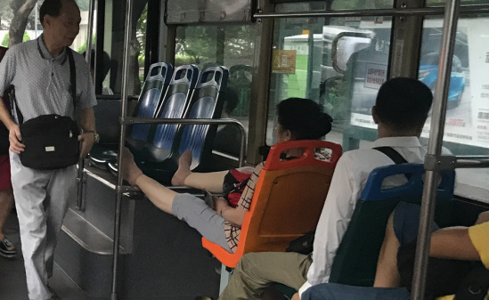 6点06分,大妈一条腿伸直,一条腿半缩回,摆出一种新姿势。刚刚上车,正在寻找作为的大叔用惊讶的表情看了她一眼。