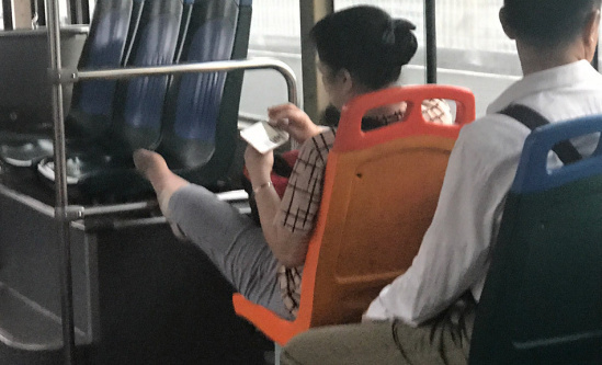绿衣女子径直走到前面,直接坐到大妈翘腿前面的位置上,而不是隔壁的空位置上。公交车停靠珠江新城站,大妈收腿下车,绿衣女子快速切换到她的座位上,一场发生在公交车里的生活小片段,也就告一段落啦。